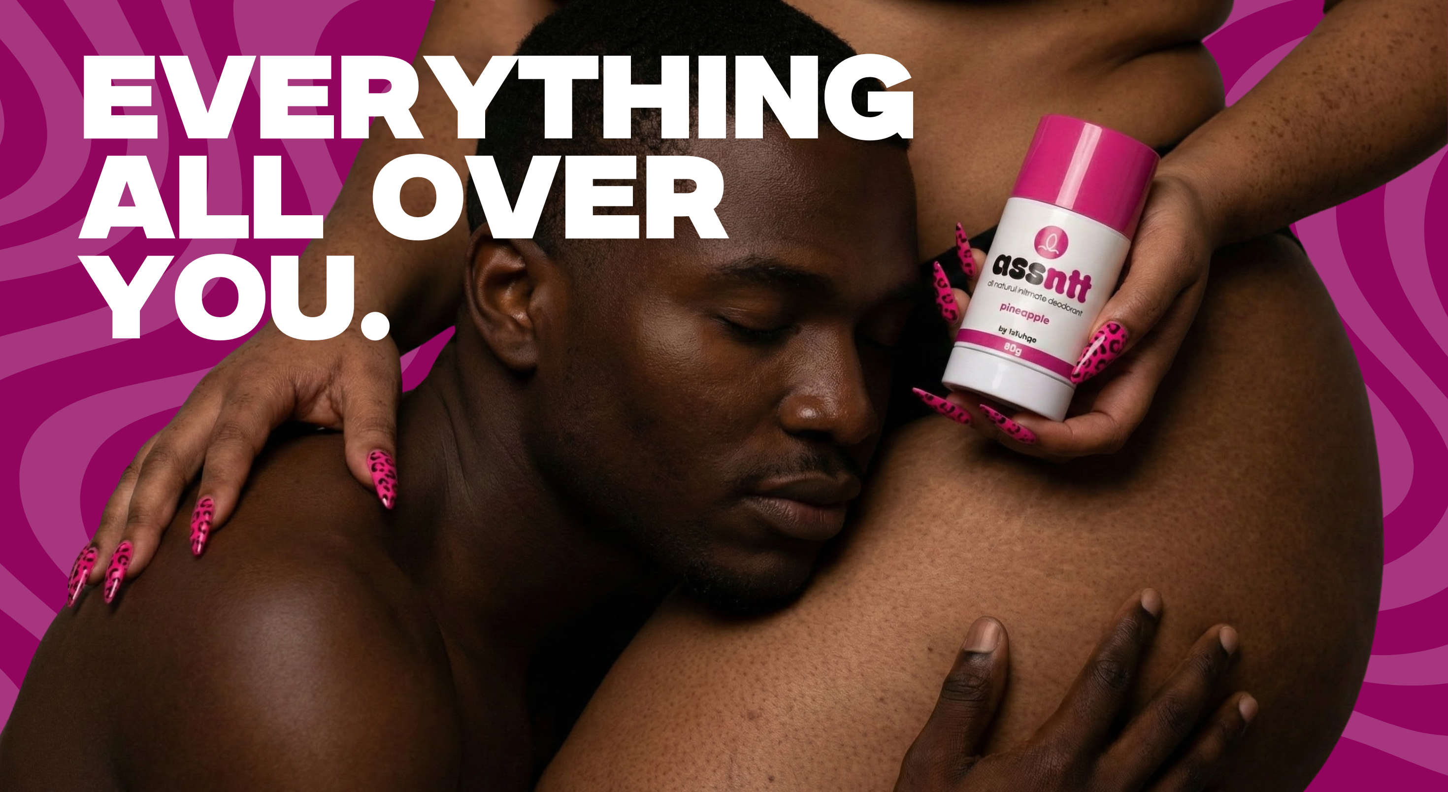 Two containers of 'assnnt' all natural intimate deodorant with pink caps on a white background.