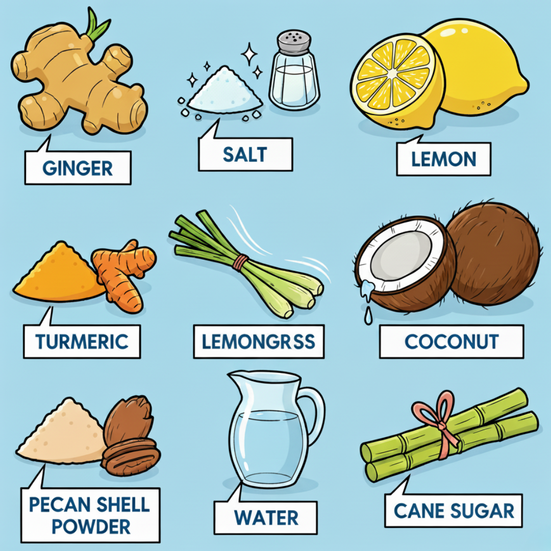 Water, Salt, Ginger root oil, Pecan shell powder, Lemongrass leaf oil, Sodium hydroxide, Sorbic acid, Lemon fruit extract, Cane sugar, Coconut oil, Tumeric essential oil, Lemon essential oil