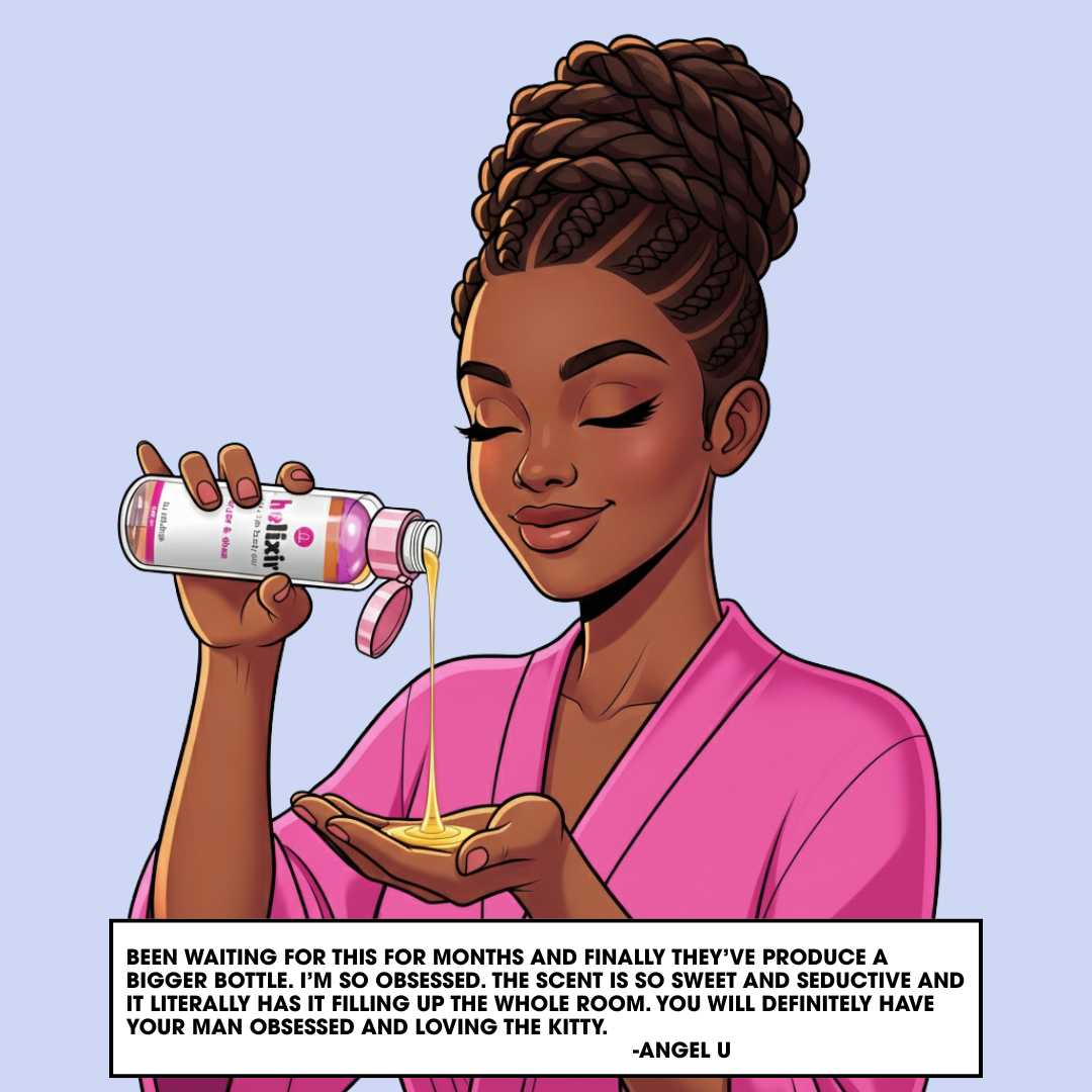 Take a luxuriating shower and use Shampoosy to later and cleanse your kitty. Butter her up with Poosy Butter and use Helixir to completely saturate your skin in our sweet, sugary, shea butter elixir. Finish with your favourite fragrance or wear nothing at all and let the heat of your body and your pheromones waft through the air until he gets a whiff and floats over to eat your poosy.