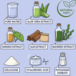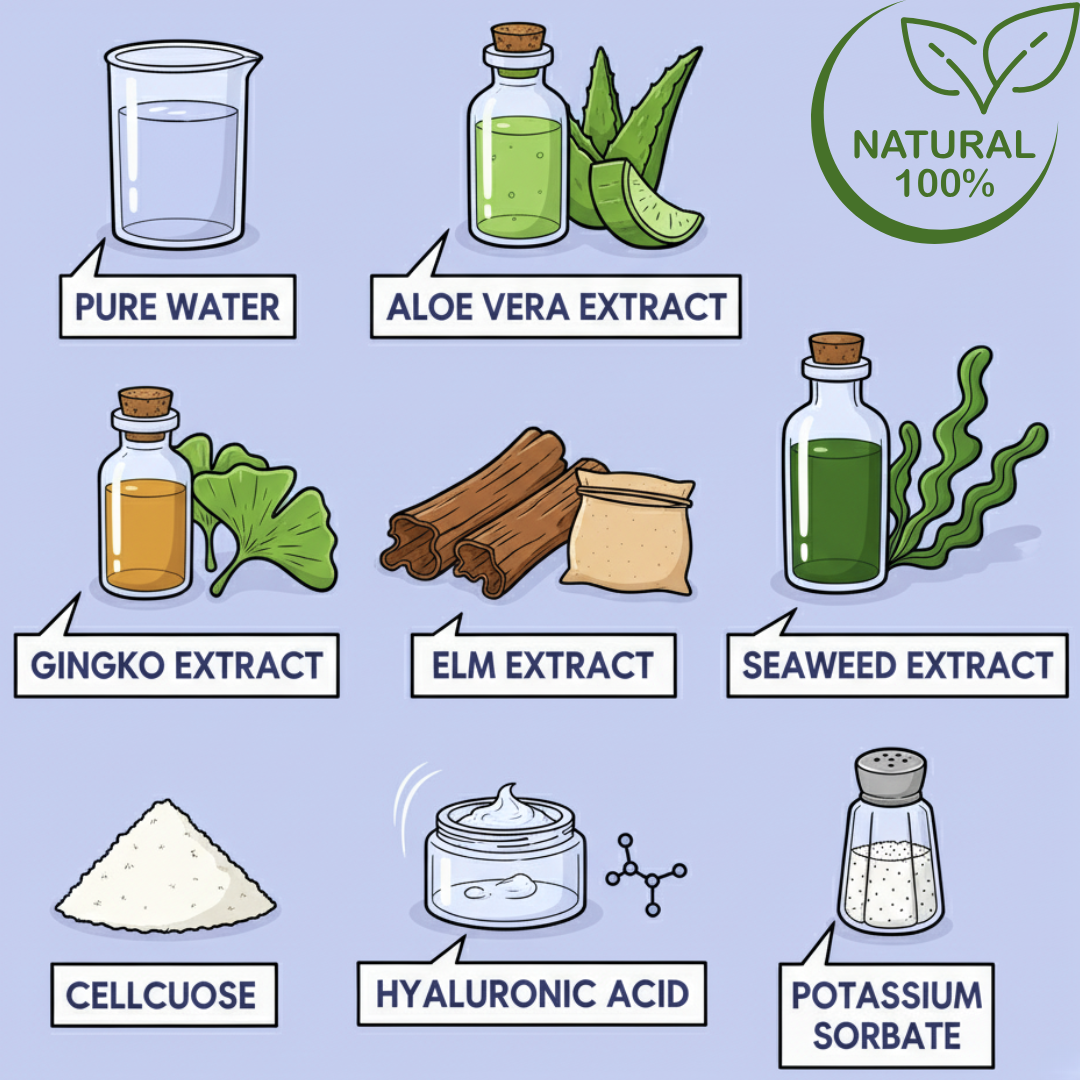 Pure water, Aloe vera extract, Gingko extract, Elm extract, Seaweed extract, Cellulose, Hyaluronic acid, Potassium sorbate