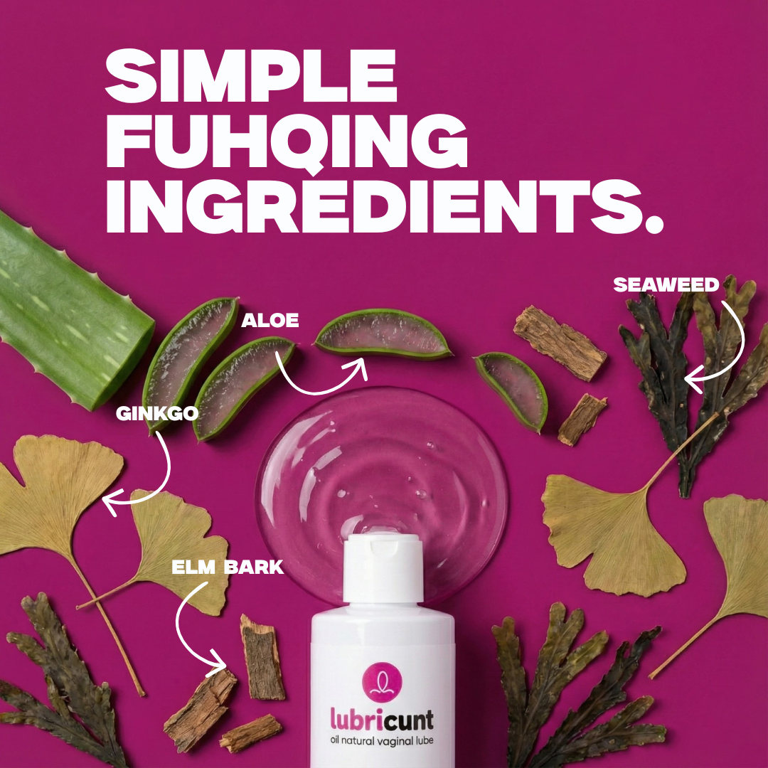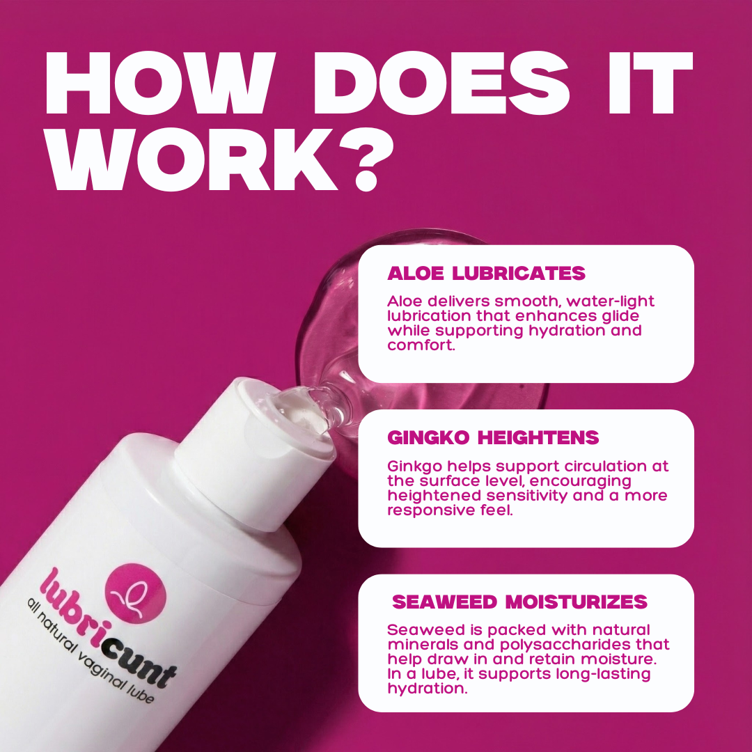 Two bottles of 'PussyPop'in' on a pink background with text.