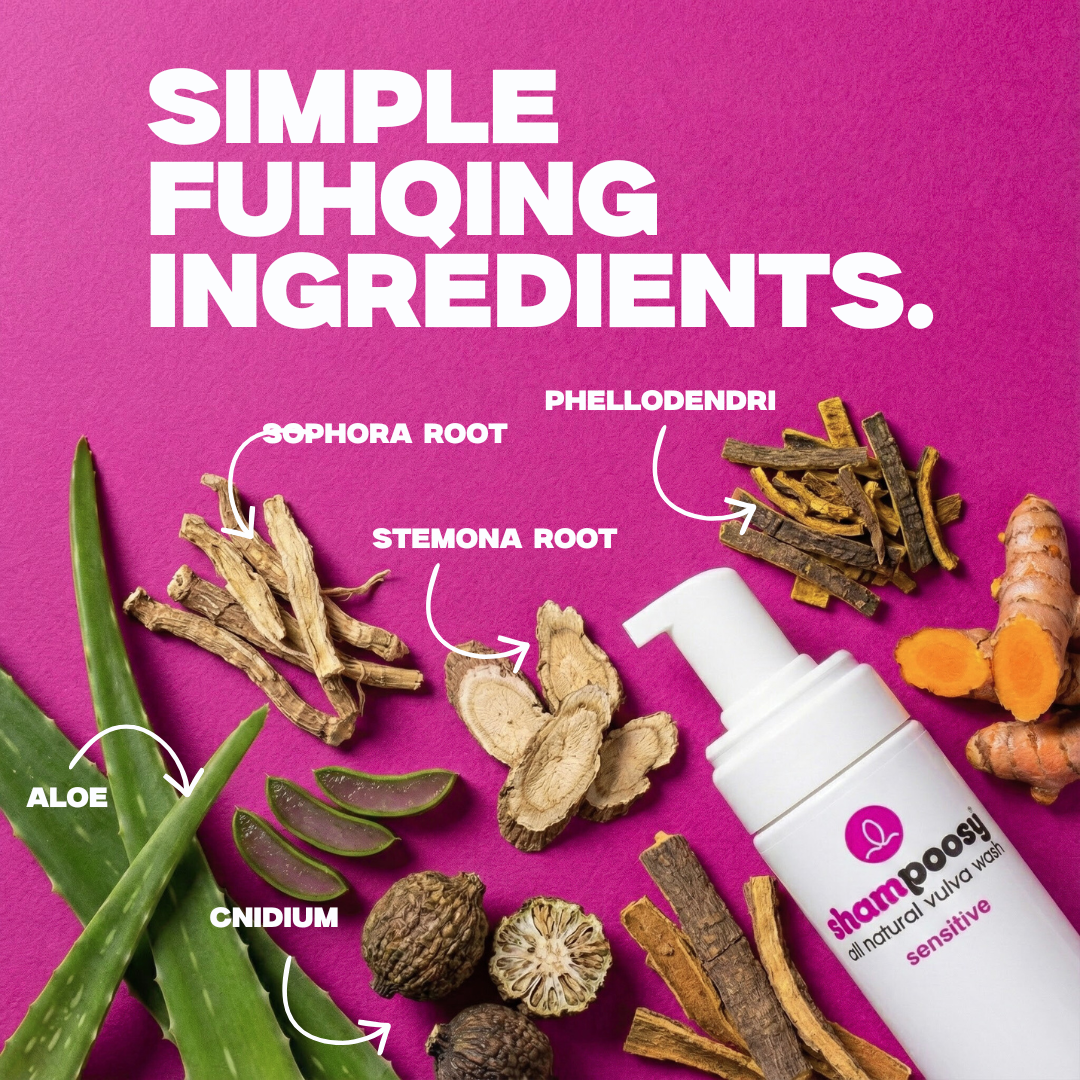 Ingredients including an orange, turmeric, lemongrass, and a bottle with text 'Simple Fuqing Ingredients' on a white background.
